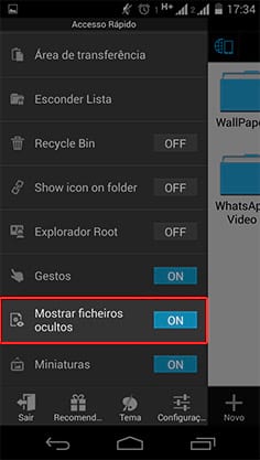 Nas opções procure pelo botão "Mostrar ficheiros ocultos" e deixe ele como ligado.